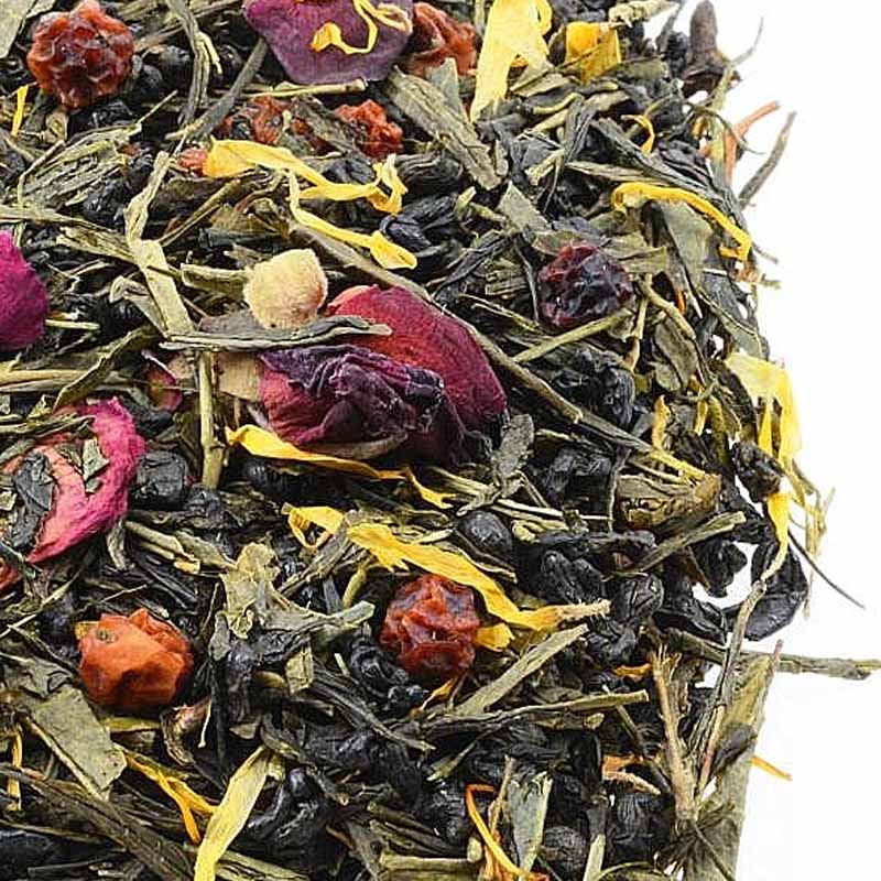 | 9 Skarbów ChinMieszanka herbat: Sencha, Gunpowder T. of H., Bancha Pai Mu Tan, Chun Mee, Oolong z dodatkiem truskawki, ananasa, słonecznika i aromatu. | Cena 50 g - 10,70 zł